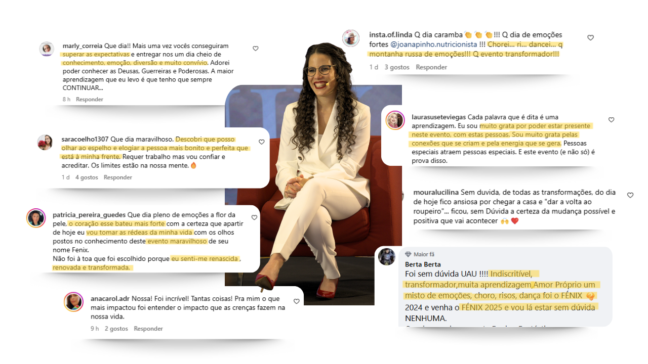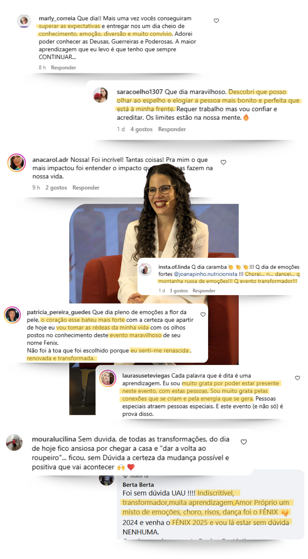 O Fénix é um evento presencial pioneiro em Portugal que une a nutrição e desenvolvimento pessoal. É uma experiência imersiva de 2 dias onde vais trabalhar a tua autoestima, autoconhecimento, amor-próprio e mentalidade.